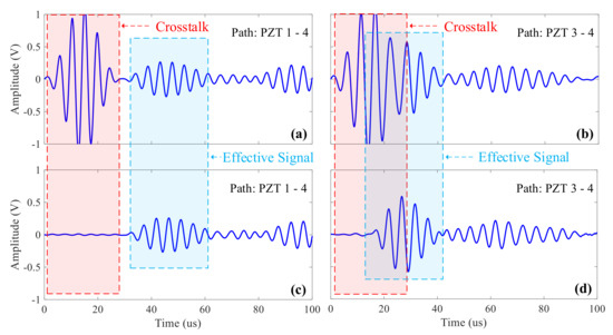 Crosstalk mainly occurs in active ultrasonic guided wave detection systems, especially in systems where actuation and acquisition sensor networks are shared. The higher the actuation signal voltage, the more obvious the crosstalk phenomenon is. In the application of some high viscoelastic materials, such as composite materials, it is often a requirement to generate ultrasonic guided wave signals with high signal to noise ratios (SNRs) brought by sufficient vibration of PZT sensors with high actuation voltage. Generally, actuation voltage with maximum amplitude within ±70 V is often selected [9,10,11]. For example, the optimal voltage amplitude of actuation signal of commercial use detector ScanGenie III is between ±50 V and ±70 V. Therefore, the crosstalk problem is particularly serious. When the distance between actuation sensor and acquisition sensor is very close, especially in the inspection of hot-spot regions, the crosstalk signals and the effective signal received often add together due to the complexity of detection areas, and there are even saturated signals, which lead to signal loss, seriously affecting the inspection accuracy [7,12,13,14]. Although the crosstalk also exists in phased array ultrasonic detection systems, it would not affect the system’s detection accuracy, which can be ignored directly, because all of the elements start to collect echo signals after the end of the actuation signal in the phased array system. The phased array ultrasonic detection systems mainly focus on the delay time compensation, which is different from how the ultrasonic guided wave detection systems work [15,16,17].