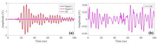 Since the damage location of the ultrasonic guided wave system is based on the comparative analysis of the signals before and after the damage, the repeatability of the signals collected by the system is very important. Displayed in Figure 13 is the same path signals acquired by the proposed system. Figure 13a is the waveform of signals after being actuated twice under the same center frequency 250 kHz, and diagram Figure 13b is the waveform of ΔE, the signal difference of the two actuation signals. It can be seen that the effective signal amplitude is about ±1.9 V; the maximum repeatability error is around ±0.039 V; and the amplitude ratio is around 2.05%, which shows that the system has good repeatability.