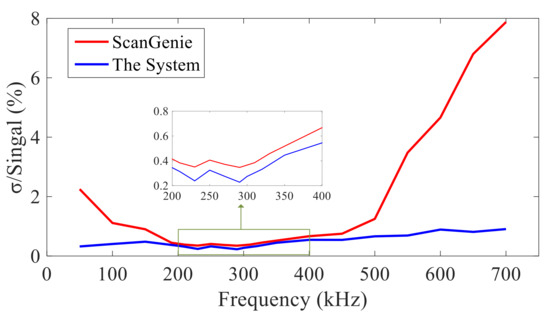 Error is calculated by standard mean square error. The system developed in this paper and ScanGenie III are tested with the actuation center frequency as 50–700 kHz. The results are shown in Figure 14. It can be seen that the repeatability of the system designed in this paper is relatively stable within 700 kHz, while the error of ScanGenie III fluctuates greatly.