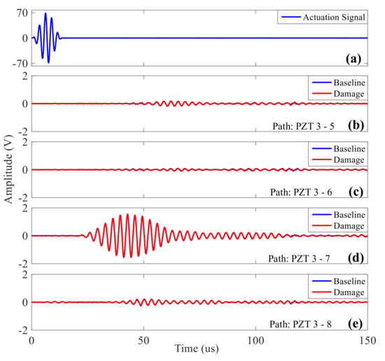 Firstly, the experimental plate is scanned at a frequency of 50–700 kHz, and the frequency that maximizes the effective signal amplitude is obtained; i.e., the resonance frequency of PZT and composite material plate. At this frequency, the acquisition signal has the highest SNR. After frequency scan, the resonance frequency in this experiment obtained is about 300 kHz. Therefore, five peak modulated sine waves with a central frequency of 300 kHz are taken as the actuation signal to collect the baseline signal and damage signal respectively. The baseline signal is the signal acquired from all paths under the condition of no damage, and the damage signal is the signal of all the measured paths after the simulated damage when an absorbing adhesive (size Φ25 mm) is placed on the glued connection structure of the surface under testing with the same actuation of the reference signal. Figure 15 shows the signal of path PZT 3-5/6/7/8 when the simulated damage is pasted around PZT 3. After comparison, it can be seen that there is an amplitude or phase difference between the reference signal and the damage signal.