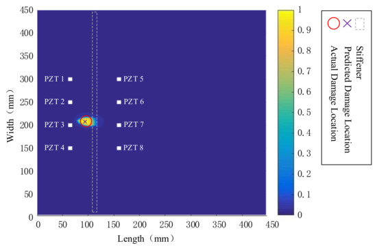 The elliptic weighting algorithm [21,22] is used to analyze the damage location of the acquired signal, the diagnostic image is obtained and the location of the damage point is output, as shown in Figure 16. The brightest part of the color of the diagnosed damage position coincides with the actual damage position; therefore, the location is accurate.