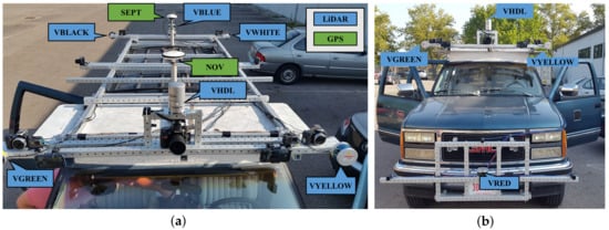 In this study, a GMC Suburban (GPSVan) [53] was used as a moving platform, and two light frames were mounted at the front and at the top of the vehicle. The sensor installation included one Septentrio PolaNt-x MC GNSS antenna, one Novatel 600 antenna GPS antenna, one Velodyne HDL-32E, and five Velodyne VLP-16 LiDAR sensors on the top platform and one VLP-16 LiDAR on the front platform. Note that the cameras are not listed here as they are not part of this study. The Septentrio Rx5 GNSS receiver, Novatel DL-4 GPS receiver, two navigation-grade H764G IMUs, and one tactical-grade IMU were located inside the vehicle. Figure 1 shows the sensor installation on the platform, and the model and location of the sensors with brief technical specifications about the sensors are given in Table 1.