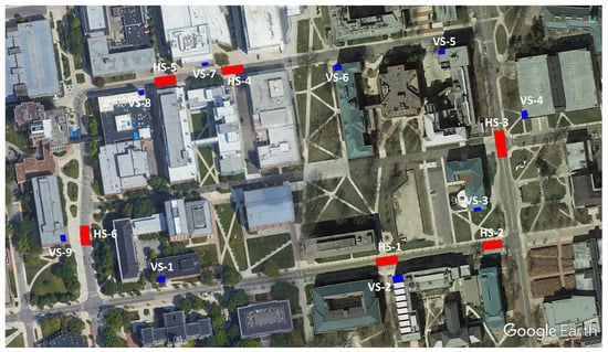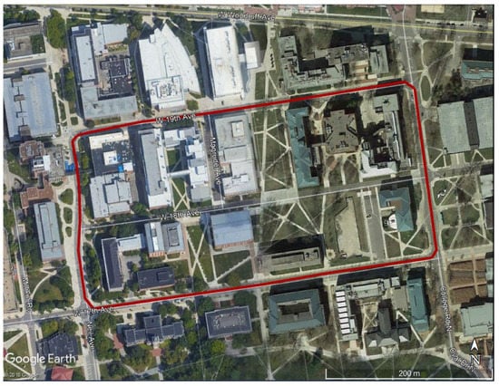 Several measurements were carried out at the Ohio State University’s main campus area, Columbus, U.S.; here, the 13 October 2017 session is considered. The area with the test trajectory, shown in Figure 3, is mixed-urban, including densely packed and tall buildings, and roads shared by cars, bicycles, and pedestrians. During the data acquisition, the speed of the platform varied at times due to the presence of 18 crosswalks, three intersections, and one curve along the trajectory. The overall length of one loop is about 1250 meters, and the mean velocity of the platform was 22 km/h. The test measurements were performed six times in the test area to obtain multiple samples and to thus help produce realistic statistics.