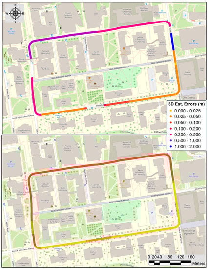 Figure 4 shows the georeferencing solution of the GNSS only and GNSS/IMU loosely coupled integration solutions for the 3rd loop; the other five loops show similar results. In the GNSS only solution, the northwestern, northeastern, and southern parts of the trajectory have gaps, where the quality of this solution is mostly at the meter level. The urban-canyon effect due to the tall buildings causes signal blockage and the multipath that could significantly decrease the solution quality. Clearly, the GNSS/IMU solution not only bridges the gaps but also improves the accuracy of the positioning and attitude data.