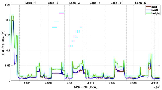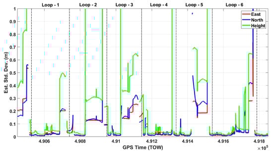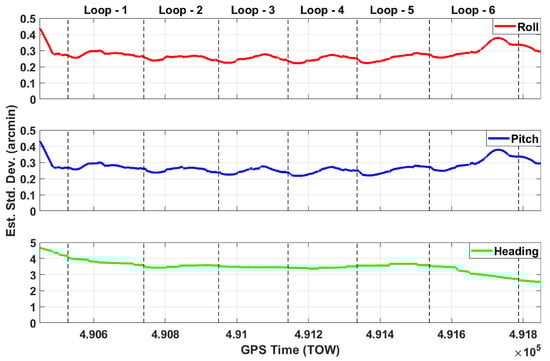 Figure 5 shows the estimated standard deviations of the GNSS only solution through six loops for east, north, and height. The gaps are clearly seen in this figure in all of the six loops, and estimated standard deviations reach up to the meter level many times in all components. Figure 6 shows the estimated east, north, and height accuracies of the GNSS/IMU solution. This figure clearly demonstrates that the fusion of GNSS/IMU provides a cm-level solution in all components without any gaps through the six loops. The estimated standard deviations of the roll, pitch, and heading components of the GNSS/IMU solution, shown in Figure 7, are at the arcmin level.
