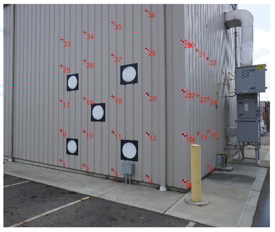 A test range was created at the main facility of the Ohio State University (OSU) Center for Automotive Research (CAR) to determine the boresight misalignment parameters of the sensors installed in the GPSVan. Five LiDAR targets which were large circles in a square with different reflectivities, shown in Figure 8, were attached to the walls, and the target locations were measured using a total station and then tied to the global system using GNSS measurements. LiDAR data sets were acquired from various directions at different ranges. The estimation process used the lever arms as fixed parameters as they were accurately measured by conventional surveying methods, and only the boresight misalignment, , in Equation (2), was estimated. The detailed information about the adopted LiDAR boresighting and sensor calibration processes can be found in Reference [54]. Using the calculated boresight misalignment parameters and lever arm values, all the sensor data from the sensor coordinate system was transformed to the platform coordinate system.