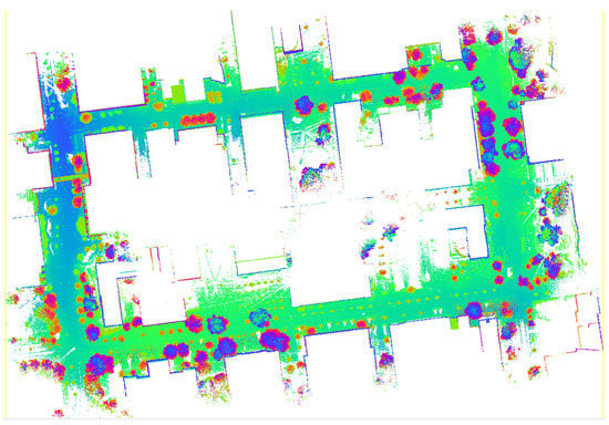 The MATLAB programming platform was used for the integration of georeferencing and boresighting data to produce the 3D point cloud in 0.1-second intervals. Since the 360 FOVs of the Velodynes had significant overlap and the reflective chassis of the vehicle caused the creation of false points, a filtering window to restrict the FOV was applied during the point generation to obtain clean point clouds. LiDAR point clouds were created from each raw sensor data, were subsequently merged into a single point cloud, and were visualized using the CloudCompare open-source processing software [56]; see Figure 9.
