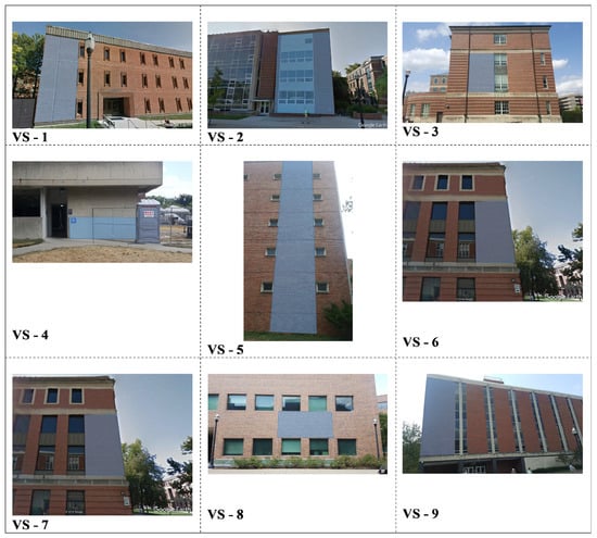 To perform the quality assessment, including a check on data integrity and absolute accuracy, checkpoints and reference surfaces were established in the area; using GNSS and total station measurements, nine vertical surfaces from building walls and six horizontal reference road surfaces were surveyed. Figure 10 shows the location of the checkpoints and reference surfaces on the OSU main campus. Figure 11 and Figure 12 visualize the reference vertical and horizontal surfaces, respectively. In order to produce the reference data of the surfaces, 11 benchmark points along the loop were established by collecting at least one-hour long static GNSS observations using a Topcon HiperLite dual-frequency GNSS receiver. Three-dimensional coordinates of benchmark points were obtained using the Online Positioning User Service (OPUS) [57]; the overall 2D/3D accuracies of points were 1 cm and 2 cm, respectively. With respect to the 11 reference points, the coordinates of the reference surface points were obtained by terrestrial measurements using a Leica TS06 plus total station.
