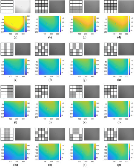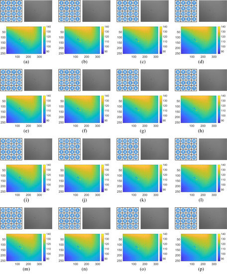 If the DMD masks are directly constructed from 16-order Hadamard matrix [19], namely, the pattern of each block is identical in each DMD mask and the patterns of all the masks are derived from the rows in a Hadamard matrix by fulling elements in column-first order, the low-resolution MWIR images have different light and dark distributions when different DMD masks are applied into the system. If a micro-mirror is placed at +12°, it is opened and indicated as “1”; otherwise, the micro-mirror is placed at −12°, it is closed and indicated as “0”. Using the blackbody as imaged scene, the low-resolution MWIR images have distinct gray-level distributions, as depicted in Figure 2. To highlight the gray level distributions of these images, different colors are used in the colormap. The gray level ranges are (150, 240) for Figure 2a and (70, 150) for Figure 2b–p. It is obvious that different DMD mask patterns lead to distinct distributions of light and dark areas in the MWIR images. It is noteworthy that the gray level distribution in each image is caused by two reasons: vignetting [26] and aperture interference. For the vignetting, as the “opened” micro-mirrors are not in parallel with the DMD plane, the brightest region is not located at the center of the MWIR image. The aperture interference changes the distributions of pixel gray values across the low-resolution MWIR images.