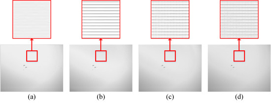 It is noteworthy that, for the last expression of Equation (8), the rows of the measurement matrix are the same. As shown in Figure 5c, in the twice low-resolution image sampling, the DMD masks are identical for one block, which is drawn in red dashed lines. Theoretically, is equal to , which means only one sampling is efficient for this block. The repeating pattern for some blocks, which is unavoidable for random binary codes, reduces the efficiency of image compressed sampling and image reconstruction.