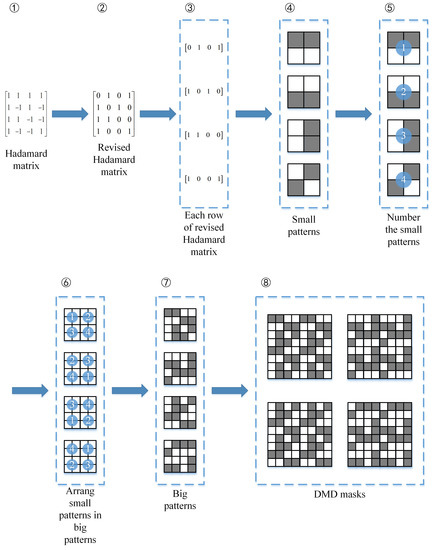 Assume that in a MWIR FPA CI system, the block size is 2 × 2 micro-mirrors, and a big block consists of 2 × 2 blocks. The Hadamard matrix is used to construct the block pattern, which has two advantages in MWIR CI. Firstly, the Hadamard matrix is full rank, maximizing the compressive sampling efficiency. Secondly, in each block, half of the micro-mirrors are “open”, implicitly improving the signal-to-noise ratio of the MWIR image. The generation process of DMD masks involves eight steps: (1) Generate a Hadamard matrix with the order equaling to the big block size B, which is 4 for this system. (2) Revise the Hadamard matrix to applicable for DMD, turning all “−1” to “0”. Using the complement vector of the second instead of the original one, all blocks have the same number of opened micro-mirrors, which may reduce the impact of pixel crosstalk [33]. (3) Divide the revised Hadamard matrix into separate row vectors. (4) For each row vector, a small pattern for each block is generated by fulling the elements of the row in column-first order. (5) Number the small patterns, from 1 to B. (6) In a big block of the size B × B, number the blocks in a clockwise direction. (7) In big blocks, replace the numbered block with the small patterns to generate the big patterns. (8) Expand the big patterns to coverage the entire DMD area and the DMD masks are obtained. This generation process of DMD masks is illustrated in Figure 4.