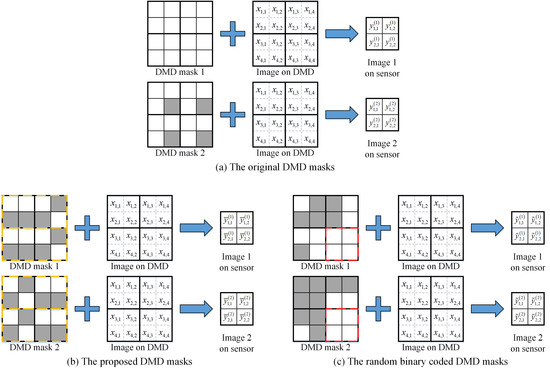 Analogously, in the proposed strategy of DMD mask design, a big block consists of 1 × 2 blocks, and all big blocks have the same pattern, which is drawn in yellow dashed lines, as shown in Figure 5b. The system model can be expressed as