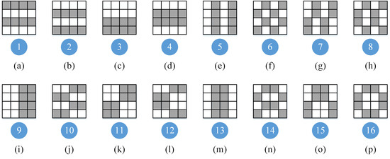 The numbers of the patterns for all blocks in DMD masks. The patterns of all blocks are generated from a 16-order Hadamard matrix. In (a–p), the block patterns are shown in the first row, and the numbers are depicted below the corresponding block patterns.