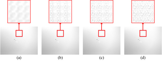 If high-resolution images are reconstructed from these low-resolution MWIR images, in which aperture interference phenomenon is obvious, the image quality is seriously influenced by BSA. In Figure 3, the reconstructed high-resolution images with compression ratios of 0.125, 0.25, 0.375 and 0.5 are shown, and the same areas are zoomed in to highlight the BSA.