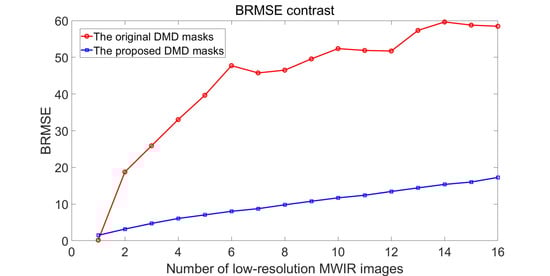 To objectively describe the effect of the proposed DMD masks, we use BRMSE to evaluate the BSA of the reconstructed high-resolution images. With the two strategies of DMD mask design, one is the original [19] and the other is the proposed, high-resolution MWIR images, using the blackbody as imaged scene, reconstructed with different amounts of low-resolution images, from 1 to 16. For our MWIR FPA CI system, 16 is the maximum sampling number, equal to the number of micro-mirrors in one block. The contrast of BRMSE for the two DMD mask design strategies is shown in Figure 9. It is obvious that the proposed DMD masks can effectively reduce the BRMSE of the reconstructed high-resolution images, which means the BSA caused by aperture interference in MWIR FPA CI is effectively suppressed.