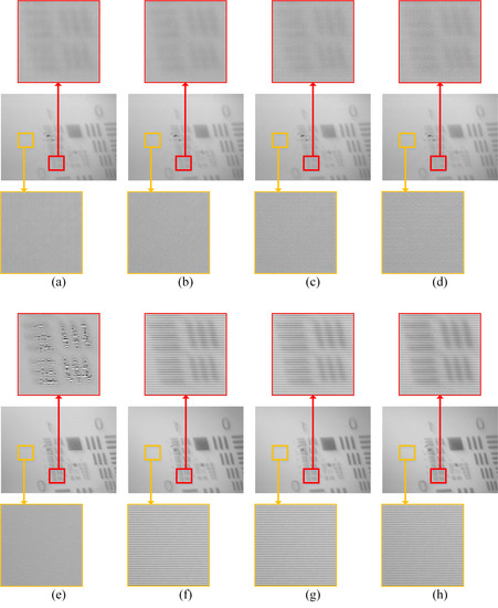 In the first row, images are reconstructed using the low-resolution MWIR images obtained with the proposed DMD masks, at compression ratios of 0.125, 0.25, 0.375 and 0.5. In the second row, images are reconstructed using the images obtained with the original DMD masks. In the flat zoomed-in zones, which are highlighted by yellow borders, the proposed DMD masks are obviously superior to the original ones. For the textured zoomed-in zones, which are highlighted by red borders, the image quality of the original DMD masks is significantly reduced in Figure 10e, but looks sharper in f–h than a–d, which were obtained using the proposed DMD masks. The reason for this phenomenon is, for the original DMD masks, due to the BSA, the gray values are unevenly assigned to every two adjacent row, making one row bright and the other dark. In viewing the overall image, the image may appear shaper, but the local features of the image are seriously damaged, which is a great obstacle for traditional digital image processing algorithms [35]. However, for the proposed DMD masks, the local features of the image are better preserved, and the line pairs are not cut into pieces as with the original DMD masks. This improvement is helpful for automatic target recognition [36]. Although the BSA cannot be completely eliminated, image qualities are improved by the proposed DMD masks in comparison to the original ones.