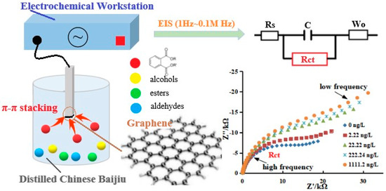 A non-invasive real-time detection technique for phthalates in Chinese liquor is proposed in this paper. This method is based on the measurement of Faradaic impedance in the presence of a redox probe, [Fe(CN)6]3−/4−, upon the absorption of phthalates to the graphene electrode surface. This absorption activity is according to the π–π stacking interactions between phthalates and the graphene working electrode which allows direct sampling and analyte preconcentration. The absorption of phthalates retards the interfacial electron-transfer kinetics and increases the charge-transfer resistance (Rct). Numerical values of Rct were extracted from a simulation of electrochemical impedance spectroscopy (EIS) spectra with the corresponding equivalent circuit. Cathodic polarization was employed prior to EIS measurements to effectively eliminate the metal ion interference. The results yielded a detection limit of 0.024 ng/L for diethyl phthalate (DEP) with a linear range from 2.22 ng to 1.11 µg. These results indicate a possibility of developing a household sensor for phthalate determination in Chinese liquor.
