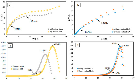 Graphene-based materials have been extensively applied because their characteristic structure endows them with a large surface area, and because of the potential for establishing π–π stacking interactions due to graphene’s delocalized electrons, allowing them to be utilized as excellent sorbents [30,31,32]. Herein, a graphene working electrode was employed to accomplish the PAEs’ in-situ preconcentration according to the π–π stacking interactions between graphene and PAEs which consist mainly of one benzene ring and two aliphatic ester groups attached to the benzene ring in an ortho configuration. EIS was employed to characterize PAEs’ absorption on the working electrode. The complex impedance is displayed as the sum of the real (Z’) and imaginary (Z”) components. A typical shape of a Faradaic impedance spectrum presented in a Nyquist plot includes a semicircular region lying on the Z’ axis followed by a straight line. The semicircle portion, observed at high frequencies, corresponds to the electron-transfer-limited process, whereas the linear part is characteristic of the lower frequency range and represents the diffusion-limited electron transfer process. Figure 2a,b shows the Nyquist plots of graphene and glassy carbon electrode with and without PAEs addition, respectively. Figure 2b appeared superimposed at high frequency with a slight deviation at low frequency, indicating the poor PAEs absorption on the surface of the glassy carbon electrode and thus a nonsignificant charge-transfer-resistance alteration. A different feature appeared on the Nyquist curves of graphene with and without PAEs addition. Figure 2a shows a pair of semicircles with different diameters, which suggests that the effective absorption of PAEs on the graphene electrode led to an increased charge transfer resistance. To achieve better resolution, a deconvolution treatment was applied to Figure 2a,b, which resulted in Figure 2c,d. In Figure 2c, two clearly separated peaks start to deviate at 223 Hz, reaching a summit at 13.6 Hz. This can be compared to Figure 2d, where two peaks are superimposed together without significant resolution.