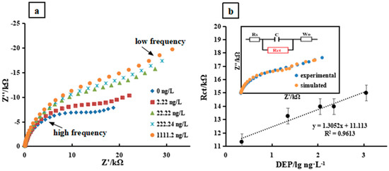 (a) Impedance spectrum of PAEs concentration gradient. The concentration of DEP was 0, 2.22, 22.22, 222.24, and 1111.2 ng/L, respectively. The measured solution contained 0.5 M NaCl and 0.01 M K3[Fe(CN)6]. EIS was measured under an open circuit voltage with an AC amplitude of 10 mV and a frequency range of 1 Hz–0.1 MHz. Each concentration was measured three times, and its mean value was plotted; (b) The Rct values with respect to corresponding DEP concentrations. The inset shows a representative simulated Nyquist curve superposed with the experimental measurements according to corresponding equivalent circuits.