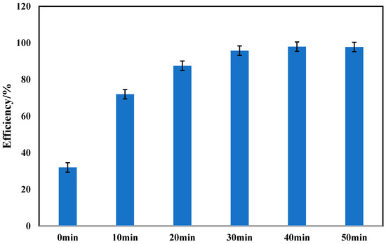 Chinese liquor is a distilled spirit made from mixed grains fermentation, which is usually stored in pottery containers after distillation for a certain period of time to obtain desired flavors. Therefore, notable metal ions migrate from the pottery jars to the liquor during the storage process [34,35,36]. The amount of metal ions in the liquor become problematic due to the similar hydrophobic features of the graphene working electrode and the metal ions. Metal ions adsorbed on the working electrode surface which give faulty signals during the EIS data collection for PAEs determination. Prior to EIS measurements, cathodic polarization with a graphite rod as working electrode at −0.1 V vs. Ag/AgCl was carried out to absorb or/and reduce metal ions on the surface of the graphite working electrode. Figure 4 presents the metal ion elimination efficiency vs. cathodic polarization duration. Without cathodic polarization pretreatment, only 30% of PAEs added into the artificial liquor were detected. The efficiency climbed up to 90% rapidly with increasing polarization time, and this reached a plateau after 30 min. This phenomenon was due to the low concentration of residual metal ions in the solution. The efficiency slightly increased to 98% until 40 min; the efficiency may infinitely approach 100% percent by continuing proceeding cathodic polarization long enough.