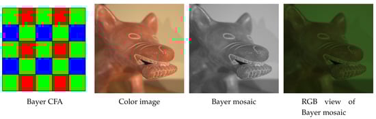The vast majority of today’s digital cameras use a single sensor with a color filter array (CFA). It is therefore necessary to interpolate the missing pixels using so-called demosaicing algorithms to obtain a complete RGB image. For the color filter array, the Bayer pattern remains the most popular one [1], and most of the demosaicing techniques are designed to interpolate such data. Figure 1 shows the arrangement of color filters in a Bayer mosaic, the image captured by the CFA sensor, and its RGB visualization.