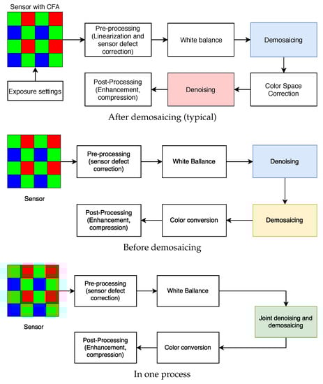Variants of raw image processing pipelines—placement of denoising algorithms.