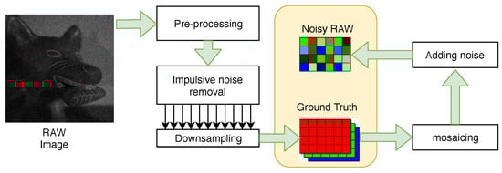 The process of developing digital negatives (DNG) starts with the output of the CFA sensor—a mosaic image registered in grayscale with a depth of 12 or 14 bits. The result of this process is usually a color image in sRGB or other space with a wider gamut, such as Adobe RGB. In the process of raw image developing, a number of operations should be performed, such as linearization, correction of sensor defects, white balancing, demosaicing, and denoising (Figure 2). These operations may be performed in different sequences, but noise reduction is usually one of the last steps of the raw image processing pipeline. It can be supposed that this approach is not optimal and sensor noise filtering should be done before the original distribution of sensor noise is altered by other raw image processing steps (Figure 3). However, to evaluate the real impact of choosing the filtering scheme it is necessary to assess the quality of the results.