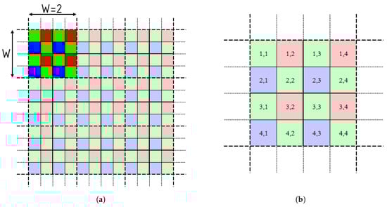 according to the color of the CFA filter (). This ensures that the evaluation of pixels of different colors is separable—whether a “blue” pixel is damaged or not can be determined from the values of the adjacent “red” pixels. The value of the indicator for a given pixel determines whether it is damaged or not. A defective pixel is replaced by a median of pixels belonging to the same color channel.