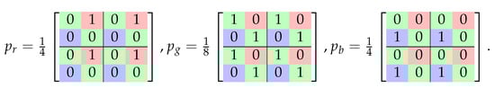 Constraint (2) ensures that the weights add up to one. A pair of constraints (3) and (4) ensures that the spatial center of gravity lies in the center of the window, because for the dimensions the center point lies in . All weights in the mask should be non-negative, which provides a restriction (5). A restriction (6) ensures that the mask weights correspond to the spatial distribution of the c color fields in the CFA filter, i.e., the pixel weights that do not correspond to the channel are zero. These restrictions can lead to many different weight distributions; however, the most desirable distribution is the least concentrated around some specific numerical value. The measure of this concentration is entropy, which is a function of the goal of the maximization problem posed (1). For the analyzed case of the window (), the masks that solve problems (1)–(6) take values as shown in Figure 8.