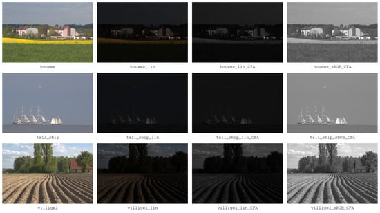 Noisy raw images are the starting point for our tests, and for their processing, it is necessary to use an appropriate combination of filtering and demosaicing; the appropriate processing sequences are shown in Table 1. Due to the specificity of the tested algorithms, we divided them into three groups: standard filters, pseudo-four channel filters (P4Ch), and direct CFA filters.