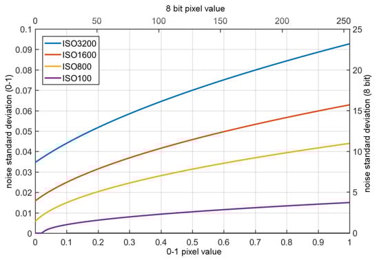 In this model, impulse noise will be understood as a faulty pixel, often called “hot”, which can take different values, but for a given pixel the value is approximately constant. Such a noise model can be added based on dark frames obtained for various real image sensors [20]. In our case, we did not analyze impulsive noise; this is due to the fact that in the case of modern imaging sensors impulsive noise is relatively small and easy to effectively remove from the raw images, however impulsive noise data obtained from real camera were also included in our data set (The noisy images are available at: https://tiny.pl/t6xtj). The model described by Equation (11) corresponds to the physical phenomena occurring in the imaging sensors causing the dominant types of noise: shot and read out noise. However, it is necessary to determine realistic values of model parameters; in our case, we used the procedure proposed by Foi et al. in the works [19]. In our study, the noise model parameters were determined for Canon EOS 500D for four different ISO values (100, 800, 1600, and 3200), the obtained parameter values are shown in Figure 11. This model can be used to model data for both monochrome sensors and those using a Bayer filter, but must be used for raw data, as the noise/signal variance dependence has been determined for such data.