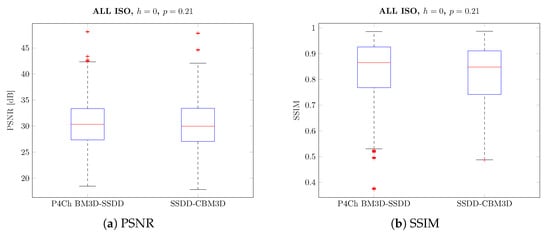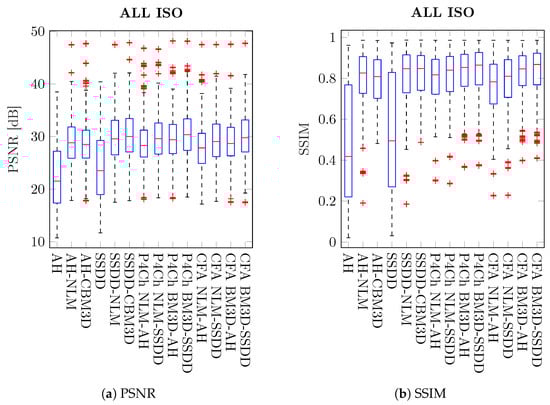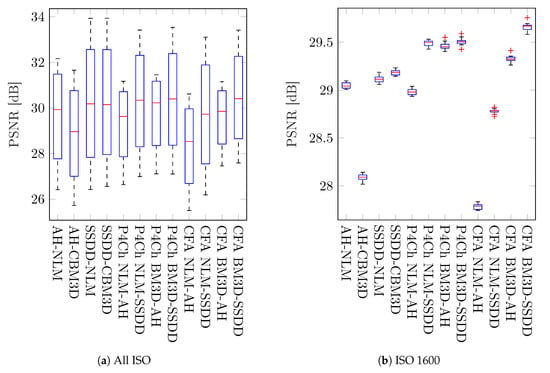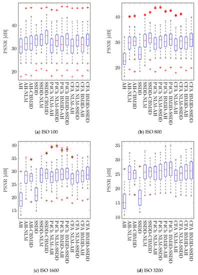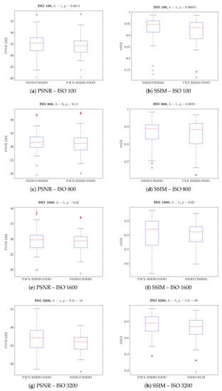 Subsequent tests were carried out for individual noise levels (ISO values)—the results obtained are shown in Figure 19, as can be seen in most cases, the differences obtained are statistically significant. As previously observed for small ISO values, better results were obtained for classical filtering methods, while for larger noise levels, CFA data filtering seems to be a better solution.