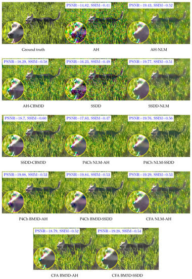 - Hirakawa, K.; Parks, T.W. Joint demosaicing and denoising. IEEE Trans. Image Process. 2006, 15, 2146–2157. [Google Scholar] [CrossRef]