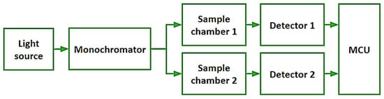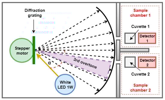 The proposed low-cost spectrophotometer works in the visible part of the electromagnetic spectrum, from 400 nm to 700 nm (see Figure 1). It is composed by a low-power light source, a monochromator for selecting specific wavelengths, and two light-isolated sample chambers. Each sampling chamber has an independent detector which allows the spectrophotometer to make measurements of the reference and the studied substance in a single experiment.