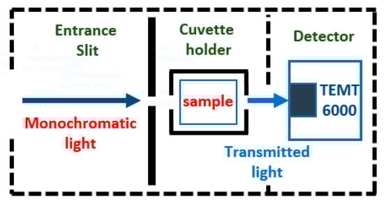A spectrophotometer is a measuring device for quantitative analysis generally used to characterize chemical substances by determining the amount of light that is partially absorbed by the analyte present in solution [1]. They can be classified according to the spectral region of work, such as ultraviolet spectrophotometer (UV), from 190 nm to 380 nm; visible spectrophotometer (Vis), from 380 nm to 750 nm; and near infrared spectrophotometer (NIR), from 800 nm to 2500 nm [2,3,4]. According to their use, they are classified in stationary devices for analysis in laboratories and portable devices for determination of substances in fieldwork [1].