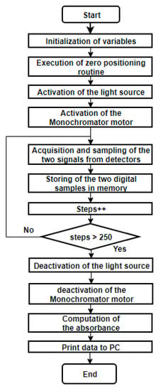 An Atmega 138p microcontroller (Atmel Corp., San Jose, CA, USA) with an Arduino interface was used to implement the control algorithms required by the spectrophotometer operation. First, an initialization routine is performed, which consists in finding an initial position for the monochromator and using a physical reference with a limit switch that guarantees that all tests start at the same wavelength. Then, using micro-stepping, the stepper motor sweeps all the wavelengths of the visible spectrum. In each step, the voltage value produced by the detector is obtained, measuring the resulting monochromatic light that has passed through the sample. This voltage is read by the analog-to-digital converter of the microcontroller, where it is filtered using a simple average digital filter. After that, the absorbance value is computed and stored in a table. The flowchart of the developed algorithm is presented in Figure 4.