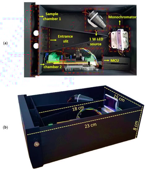 - Alam, A.E.; Islam, R.; Faria, I.J. Development and validation of a low-cost visible light spectrophotometer. In Proceedings of the 2017 4th International Conference on Advances in Electrical Engineering (ICAEE), Dhaka, Bangladesh, 28–30 September 2017; pp. 653–657. [Google Scholar]