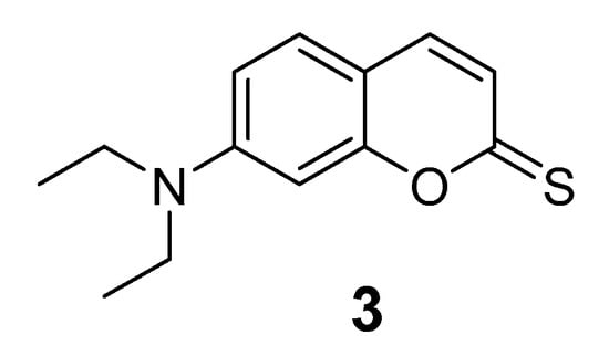 Compound 3 was prepared in three synthetic steps (Supplementary Materials Scheme S1). 4-(diethylamino)-2-hydroxybenzaldehyde (1) was condensed with diethyl malonate in a Knoevenagel condensation and cyclized and decarboxylated in one step to afford 7-(diethylamino)-2H-chromen-2-one (2). Then, the compound was modified with Lawesson’s reagent (thionation agent) to obtain the compound 7-(diethylamino)-2-chromene-2-thione (3) (Figure 6) [46]. The final product was characterized by using 1H and 13C Nuclear Magnetic Resonance (NMR) spectroscopy and High Resolution Mass Spectrometry (HRMS) (Supplementary Materials Figures S3–S7).