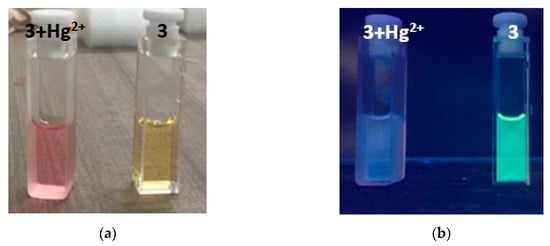 (a) Colorimetric change of compound 3 in the presence of mercuric ions; (b) fluorimetric change of compound 3 in the presence of mercuric ions.