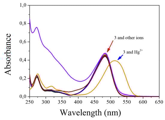 Compound 3 was tested with different metals (Hg2+, Cd2+, Pb2+, Ca2+, Mg2+, Zn2+, Fe2+, Fe3+, Cu2+, Mn2+, and Co2+). When testing metals, it is observed that only mercuric ions react with chemosensor 3 very quickly and selectively, showing a colorimetric (Figure 7a), fluorimetric (Figure 7b), and spectrophotometric UV-Vis (Figure 8). In reviewing the phenomenon that occurred in the latter result being notorious, by adding mercuric ions in the solution of compound 3, there is a decrease in the band of 483 nm and a bathochromic displacement to 513 nm; then, over time, it is observed that the 513-nm band decreases and that there is a hypochromatic shift with an increase of one band in 388 nm UV-Vis [46] (Supplementary Materials Figure S10) and an isosbestic point at 432. Using different concentrations of mercuric ions (0.25 to 2.5 µM), the detection limit was calculated as 1.1 × 10−9 M and a limit of quantification was calculated as 3.7 × 10−9 M. In addition, we emphasize that, when testing with the addition of mercuric and other ions simultaneously, no interference was observed.