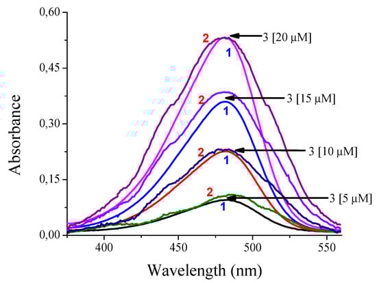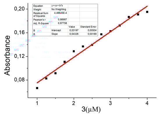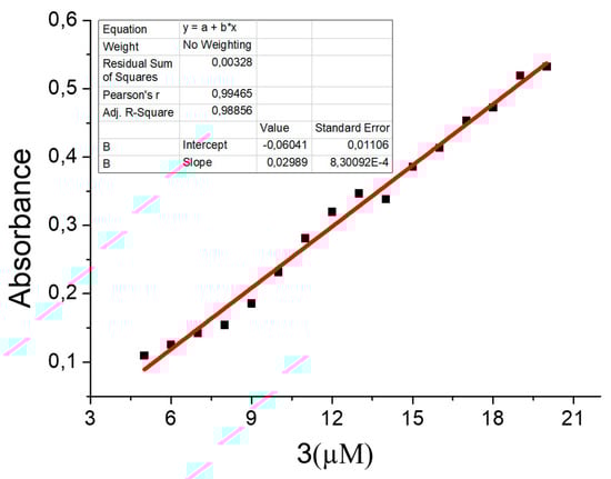 The main photophysical constants of compound 3 were determined, showing an excitation band (λex) at 483 nm (λex) and an emission band (λex) at 510 nm (Supplementary Materials Figure S8); a molar extinction coefficient, which is 15,754 M−1 cm−1 (Supplementary Materials Figure S9); a quantum yield of 0.013; and a Stokes shift of 27 nm.