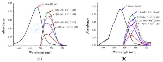 Absorbance the compound 3 and response in front mercuric ions: (a) spectrophotometer Cary® 60; (b) the low-cost spectrophotometer in H2O:EtOH 80:20.