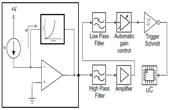 Generally, a VLC sensor is based on a PIN photodiode working in the photoconductive mode and connected in a transimpedance configuration. The photodiode generates an electrical current proportional to the incident light. The transimpedance circuit transforms the produced photocurrent into a proportional voltage that is further processed in order to extract the data. Nevertheless, this article proposes a novel approach based on a transimpedance circuit having a logarithmic behavior (Figure 1). The development of the logarithmic transimpedance circuit basically follows the design of a linear transimpedance circuit except that the linear resistor (i.e., linear behavior) that establishes the gain of the circuit is replaced by a block/component/circuit that has a logarithmic behavior.