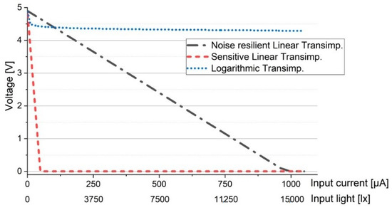 Thus, this section simulates the logarithmic transimpedance circuit response in varying lighting conditions, ranging from 0 lux to approx. 15.000 lux. The simulation parameters are resumed in Table 2. The 15.000 lux limit has been considered based on the impact that an IR-reject optical filter and an adaptive receiver FOV can have on decreasing the illuminance of the direct sun exposure (which may reach up to 100.000 lux) at the VLC sensor level [36,37]. In order to be even more convincing, the response of the logarithmic transimpedance circuit is compared to the response of a linear transimpedance circuit. Furthermore to provide an adequate and a fair comparison, two linear transimpedance circuits have been simulated: a linear transimpedance circuit designed in order to be highly resilient to noise (i.e., ≈ 15.000 lux) and a linear transimpedance circuit designed for high sensibility. In the first case, the simulation results (Figure 2) showed that although the resilience to noise is quite high, the sensitivity of the circuit is significantly affected, meaning that such a sensor will not be able to detect low light intensity variations, which in turn significantly affect communication distance. Now if it is to compare the sensitivity of the circuit with a VLC emitter irradiance distribution with respect to the distance, one can see that the communication distance becomes limited to just few meters. In the second case, where sensitivity was the priority, the simulation results have showed that although the higher sensitivity enables the detection of low power signals and thus, longer communication ranges, the circuit is easily saturated and consequently it is incompatible to VLC applications that imply direct sun exposure (Figure 3.).