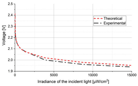 Experimental evaluation of the logarithmic transimpedance circuit ability to mitigate photoelement saturation. The graphic illustrates the circuit’s response to an increasing incident light. One can see that although the incident irradiance reached 15,000 μW/cm2, the circuit still responds to changes in light intensity.