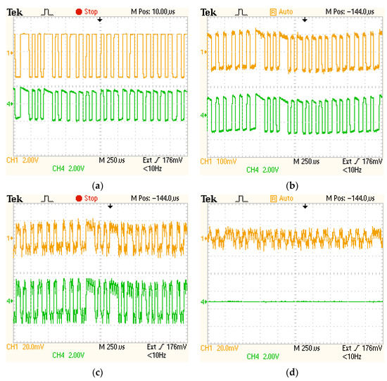 Comparative experimental evaluation showing the response of the logarithmic (Channel 1—orange) and of the linear (Channel 4—green) transimpedance circuits: (a). in dark conditions (no additional background light); (b). in high SNR conditions (incident noise irradiance of 200 μW/cm2); (c). in medium SNR conditions (incident noise irradiance of 1100 μW/cm2); and (d). in low SNR conditions (incident noise irradiance of 4500 μW/cm2). One can see that as the irradiance of the parasitic light is increasing, the logarithmic transimpedance circuit reduces its sensibility in order to prevent the photoelement saturation. On the other hand, the linear transimpedance circuit is saturated when the irradiance of the incident parasitic light increases above a certain limit. These experimental results confirm the benefits of the logarithmic transimpedance circuit.