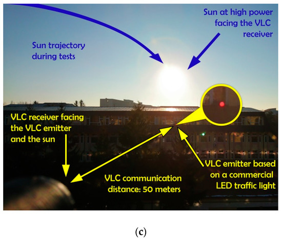 Picture showing the experimental setup for the 50 m VLC tests: (a) outdoor tests performed in moderate background lighting conditions; (b) strong sunlight conditions with the sun positioned left of the VLC receiver; (c) VLC evaluation in strong sunlight conditions: The VLC receiver is facing the LED traffic light VLC emitter. The positions of the VLC emitter and of the VLC receiver are static whereas the sun position is changing. During the afternoon, the sun is directly facing the VLC receiver.