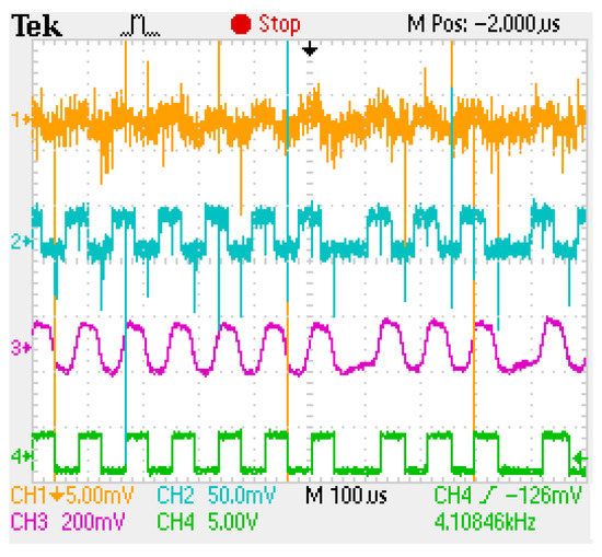 Scope screen illustrating the signal reconstruction process at the level of the different blocks of the VLC sensor: Channel 1 (orange) shows the output of the logarithmic transimpedance circuit; Channel 2 (blue) shows the output of the transimpedance circuit after a 24× amplification; Channel 3 (purple) shows the output of the filtering block; Channel 4 (green) shows the reconstructed signal which will be used in the data decoding process.