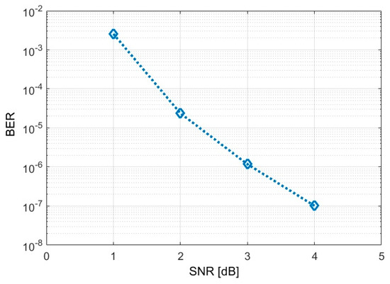 For subsequent tests, the logarithmic transimpedance based VLC receiver is evaluated in outdoor sunny conditions. For these tests, the VLC receiver is orientated toward the traffic light VLC emitter and the communication parameters are evaluated while the sun is traveling the sky. As these experiments are performed during a different moment of the day, from morning to sun fall, the VLC receiver is exposed to different sunlight powers and different incidence angles. Thus, during these testes, the VLC receiver is exposed to bright sunlight having the irradiance up to 67,250 μW/cm2 (Figure 7b), whereas as the sun is close to sunset, it is directly facing the VLC sensor. Consequently, one can see that these situations are very representative for the worst case VLC scenario as they imply long range communications (i.e., 50 m), outdoor conditions, strong light, and direct sun exposure. Accordingly, in order to maintain connectivity in such harsh conditions, the FOV of the receiver has been narrowed to 15° (±7.5°), whereas as the sun went toward the sunset and it was directly facing the VLC receiver, the FOV has been further narrowed to 7.5° (±3.75°). Figure 7c clearly illustrates the experimental setup showing the VLC receiver simultaneously facing the VLC emitter and the sun, whereas Figure 8 illustrates the shape of the received signal and its reconstruction process at the VLC receiver level. One can see that in strong sun exposure, the logarithmic transimpedance circuit prevents the saturation of the PIN photodiode and it is able to maintain the communication link. Nevertheless, in these conditions the logarithmic transimpedance circuit provides a signal whose amplitude does not exceeds 2–3 mV and which is very affected by noise. However, due to an adequate signal processing plan, the VLC receiver is able to reconstruct the signal and to accurately decode the data. The summary of the experimental evaluation in bright sun conditions is also presented in Table 7, whereas the BER as a function of the estimated SNR is illustrated in Figure 9. A discussion concerning the results is provided in Section 5.