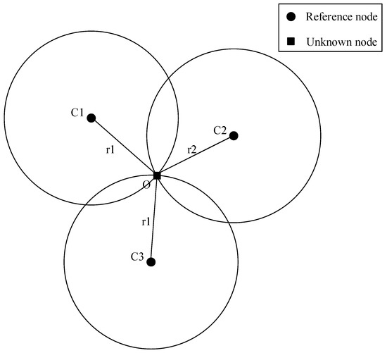 Figure 1. Schematic diagram of triangulation.The Iterative Trilateration-based Localization Algorithm first randomly generates three positions, and finds an estimated point using the traditional trilateration algorithm with the three generated positions, and then replaces the farthest generated position with the estimated point. This trilateration iterates continuously until the termination conditions are met. Figure 2 shows the schematic diagram of the Iterative Trilateration-based Localization Algorithm.